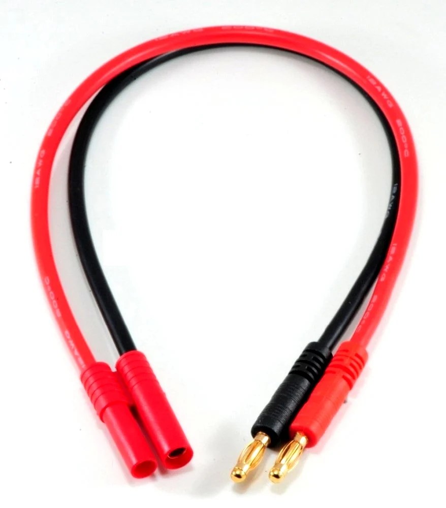 Este es el cable de carga para baterías que en un extremo tiene los conectores banana estándar de 4 mm para adaptarse a la mayoría de las unidades de carga y el otro extremo tiene un conector HXT de 4 mm.